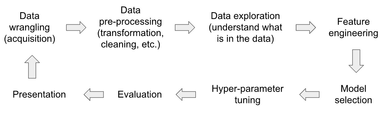 While there are some efforts to automate the process of build machine learning model (commonly known as ‘AutoML‘), there are many tasks in the different stages of a data science pipeline (see the diagram below) cannot be fully automated. For example, for ‘Data Wrangling’ a decisions have to be made on which dataset to use and what pre-processing to be performed, and these cannot be easily automated.