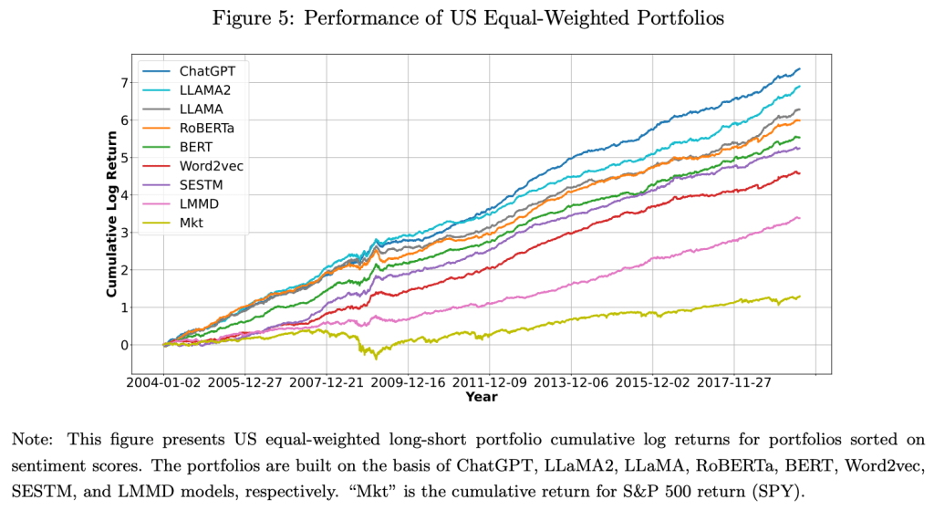 News sentiment can be used as an input to the trading model, together with other data such as pricing and volume. We tried LLM sentiment analyse, as it is much better than traditional NLP (Natural Language Processing) techniques. The inspiration came from paper Expected Returns and Large Language Models, which compared the impact of different LLM sentiment analysis, which has much better return than the baseline S&P500 buy-and-hold (see the figure below). The best performing model (chatGPT) has a 10^7 (10 million) times return on the investment fro the period between 2004 and 2018 (the return of the base is about 10 times). Of course this is not quite achievable in practice.
